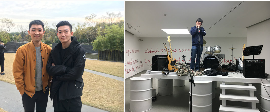 看到口琴表演开始,我暗自感慨总算有一个(虽然是最后一个)表演项目是按照美术馆发布的节目单来的,不用追着快闪般的行为满场跑了。尽管里克力·提拉瓦尼本人没有到场,台上这位来自南大的吹奏者的在场意味着《油罐舞台》不仅献给艺术家,也属于任何愿意上台的观众。穆里洛在一楼美术馆入口对面的墙上分别用红色与黑色颜料写下“Yutaka Sone”(曾根裕)和“obsidian”(黑曜石),而楼下的口琴表演者将手中的乐器换成了吉他,演奏起Eric Clapton的《Wonderful Tonight》。 两人在各自的时空中遥相呼应,发出开幕已接近尾声的信号。黄昏时分,一大拨人搭大巴车返回火车站,今晚留宿南京的客人则乘班车去往一间高档样板房,享用私厨。我和管钧决定先往山里走走。他为我介绍了沿途的实验建筑,还特意带我抄近道去他和唐狄鑫驻留过的工作室看了一眼。行走在惬意的山间,我逐渐意识到,不论是曾根裕,还是24小时前从上海临时组团来南京的艺术家,大多和四方保持着非一次性的长期合作关系,他们参加展览或开幕也许是抱着回家看看的心态。