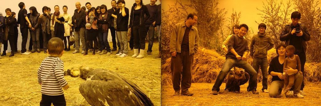 《饥饿的苏丹》原是给英国的一个展览报的方案,因法律原因未遂。此次在长征空间的实施,颇费周章:运了八十多立方土进展厅,在北京挖树、去山东买稻草,(由于对稻草的体积没有概念,买回八吨,扔了一半),寻找秃鹫标本,在表演者活动区铺设地暖,等等。
