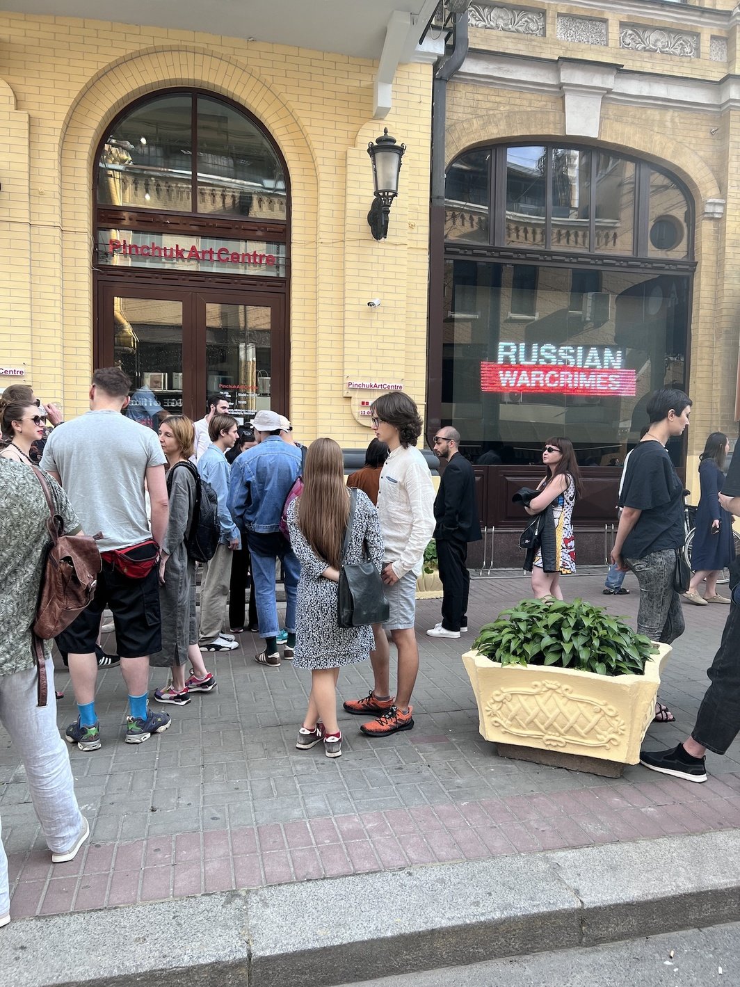 “俄罗斯战争罪”(Russian War Crimes)和“当信念移动山脉”(When Faith Moves Mountains)于7月中旬在平丘克艺术中心(PinchukArtCentre)开幕。这座位于基辅市中心的当代艺术机构,此前因为俄罗斯民族统一主义的侵略而关闭。在加入基辅的大展览之前,“俄罗斯战争罪”已经在世界经济论坛和布鲁塞尔的北约总部开幕,展览记录了俄军入侵乌克兰犯下的残忍暴行。观众被夹在两面巨大的平行展墙之间;一面墙用壁画大小的乌克兰信息图上标识出了各种“反人类罪行”的调查;第二面墙则通过50张摄影照片来描述其中一些事件。这种展览方式令人震颤,尽管其所用图像早已在无数新闻报道中变得常规化。