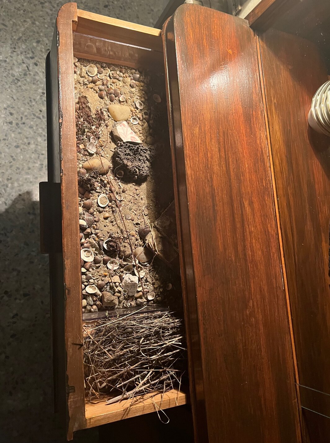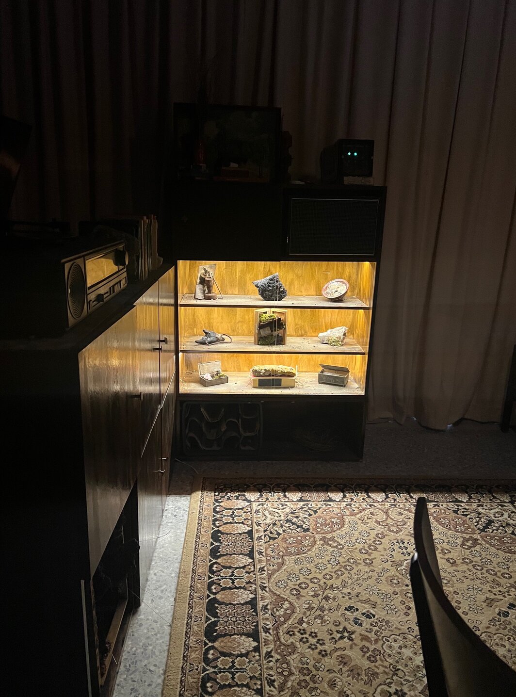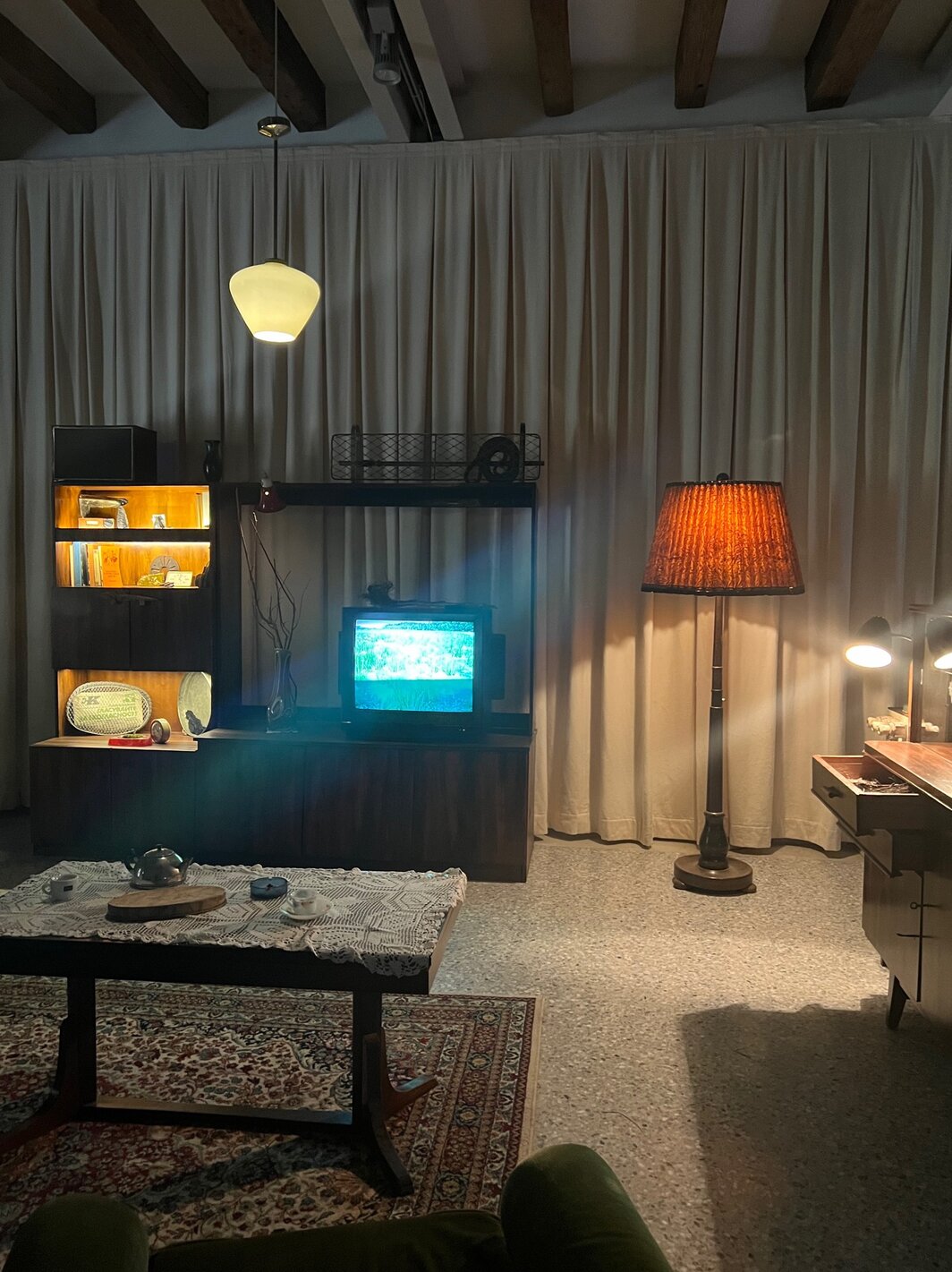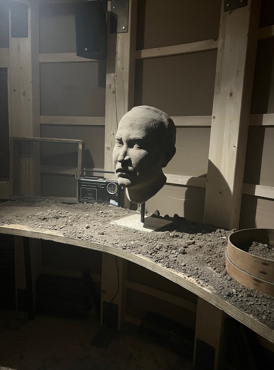 对于无法注册参观罗马教廷展馆的观众(包括笔者本人)——位于朱代卡岛女子监狱,并拥有梵蒂冈级安保(教皇本人将于周六访问)——我强烈建议你去一趟朱代卡运河对面的保加利亚馆,在那里可以看到一次对政治监禁在心理层面上遗留影响的深度挖掘。 艺术家克拉西米拉·布塞瓦(Krasimira Butseva)、朱利安·切希里安(Julian Chehirian)和莉莉亚·托普佐娃(Lilia Topouuzova)三人共同参与的这次展览“邻居们”(The Neighbours)脱颖而出,成为 2024 年威尼斯双年展不可避免种类繁杂的国家馆呈现中最具凝聚力的一个。 在馆内,你会被引入一个阴沉、黑暗的房间,里面放着老式家具、破旧的灯,玻璃柜里还陈列着跳蚤市场上常见的古玩。 在二十年研究的基础上,此次展览再现了保加利亚古拉格集中营幸存者的家。 架子上不可思议地塞满贝壳和沙子等天然物品,默然致意着囚犯被释放时作为古拉格生活的苦涩纪念品带回家的东西。