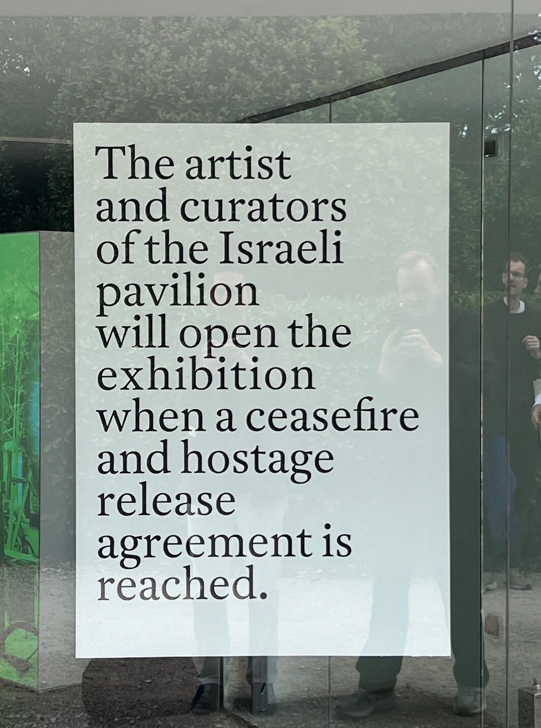 与这些努力相反,绿城花园里许多庞大的国家馆都致力于针对我们这个时代沉重的政治进行焦虑的讨论,但似乎都未有成效。 “我试图拆解民族国家的概念,”德国馆策展人Çağla Ilk周二告诉我。好样的。 但在绿城花园里,历史责任的沉重——以及每个展馆都需要对其主办国设定的国家政治目标负责——往往会让观看变得缓慢。 在约翰·亚康法(John Akomfrah)一到威尼斯就感觉已经不行了的英国馆里,杂乱无章、挂得过满的影像——内容涵盖了移民生活和独立运动故事——看起来就像整个展览都是按开会用的PPT组织起来的,没有半点生命。以色列馆干脆关上大门,在我看来,这不失为一个抗议以色列政府对加沙战争的完美姿态。