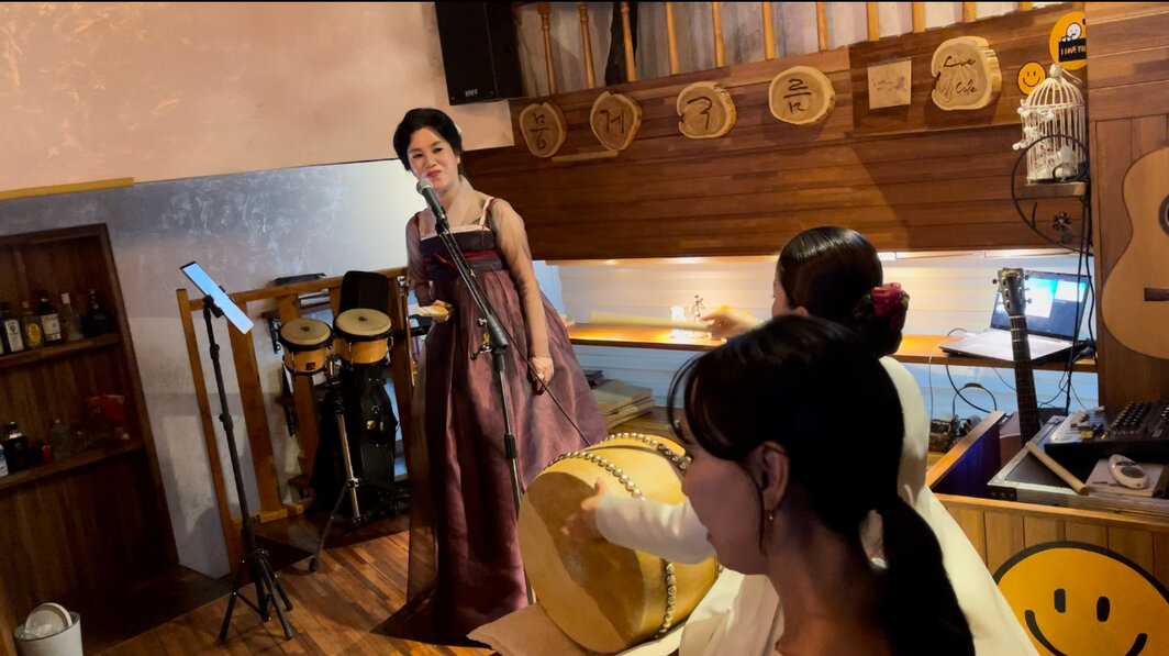 傍晚,马不停蹄奔向棉花云酒馆,去听音乐家Sora Kim和Eunkyung Gyun带来的英语Pansori表演。这种表演需要一名演唱者和一名盘索里鼓手合作,同时配合观众的即兴和声。作为女性,Sora的唱腔在高亢的同时又雄浑粗犷,事后得知,这是一种叫做“得音”的演唱境界,需要从儿时开始,经过数十年的练习,让声带不断磨损沙哑,然后才能获得的一种特别的超高超宽音域。达到“得音”境界的演唱家被称为“名唱”。Sora的二创虽然取材自英文诗歌,但“得音”唱法本身的痛处还是提示着它的东亚起源。这让我和旁边《ArtReview中文版》的编辑聂小依自然地讨论起这种“英韩合璧”创意可能的前史,一个也许关联着广播剧、驻军和女性的故事。