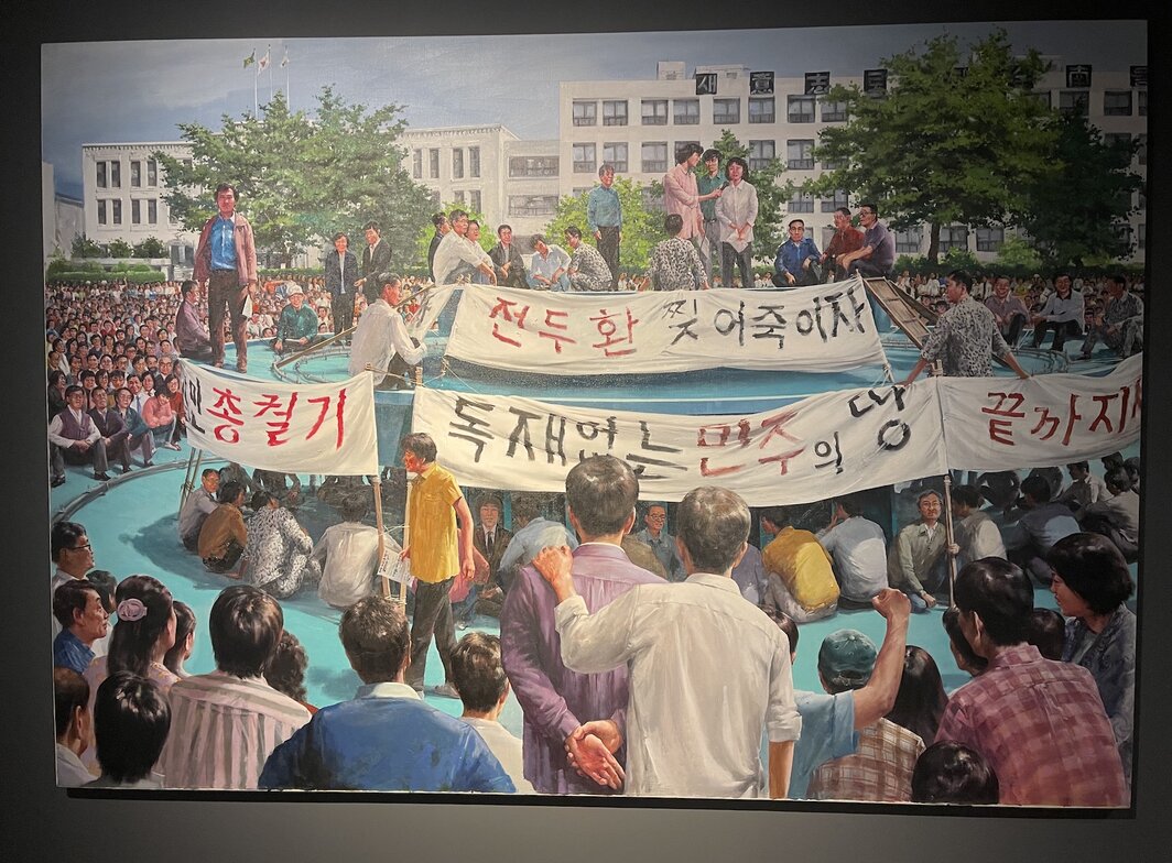 最后一天,跟王欢先去了光州艺术博物馆,看同期开幕的展览“侍天与民”(Serve the God, with the People: From the Eastern Learning to the May 18th)。展览将传统文化资源和光州政治遗产做了勾连,似乎传达了某种韩式主旋律。参展作品的时间跨度近50年,有我们很熟悉的现实主义风格,还有韩国传统的民画和东洋画,也包括影像、舞蹈和行为。与双年展和首尔艺术季的全球化气息相比,这些艺术家大都毕业于本土国立大学的美术系,由此看来这里的艺术生态,至少曾经,也并不是铁板一块。