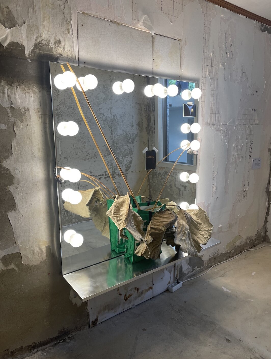 我对这种无所不包的修辞方式不太感冒,但参展艺术家各自的创作脉络有不少值得体味之处。我和同行的朋友都为Mira Mann使用档案的方式所动容:梳妆镜组成的作品《风之物》(objects of the wind),追溯了1970年代远涉柏林的韩裔女性护工的历史,并打捞了她们的集体表演形式“风物”(pungmul)。艺术家把档案作为装置材料本身,使其成为梳妆台的装饰物,也直接指涉了冷战中跨国女性劳工飘零的日常。