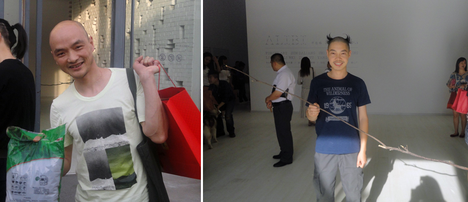 一进画廊门口先被一根底部安有弹簧的树枝横向挡住, 看着现场观众如何“穿过” 杨心广的作品《有弹簧的树枝》而进去展厅,你可以看到面对无法选择的情况时,人们如何表现。有的人把它压下去,导致树枝反弹回来会打到后面的人;有的钻过去,有的把它抬起来再轻轻放下,而大部分人是绕过树枝进入展厅。在中国,我们太熟悉这种“怕惹麻烦,绕路而行”的感觉。杨心广站在树枝附近,顶着两个小尖犄角像个“小恶魔”看着大家,这是他和艺术家杨健为今天展览特意剃的发型,我问他为什么,杨心广说“你看我这样有点奇怪是吧?对了!我就是想让来的人看着不顺眼、不舒服”,这个直接、干预性很强的作品给人留下印象很深。