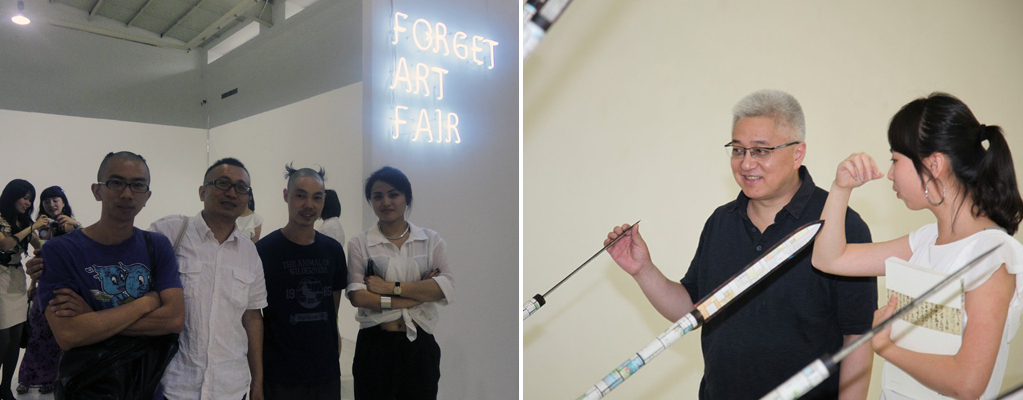 进到展厅首先看到的是位于中间的一个“大白盒子”,这是“Forget Art Fair”的摊位,项目策划人马永峰热情给大家介绍:“这是一个迷你“巴塞尔”艺术博览会,这次空降到商业画廊的空间里,是脱离商业艺博会的一种尝试”。 当被问道:“那你这次选择在一个商业画廊里做这个作品到底能体现出与商业艺术博览会的什么不同呢”,他回答:“如果艺术家不和画廊合作,还可以和Forget Art Fair合作”。这次带来的5件作品都是看上去“不好卖的”,除了一幅油画,其它都是装置和录像作品(李山《One》,马永峰《透明是错误的》,吴小军《不要害怕》,杨健《想要离开》)。 马永峰还说“Forget Art Fair刚开始会和画廊合作,之后也计划在美术馆、非营利空间等不同场所展出,希望能探索出一种新的展出、销售模式”,马永峰在现场也充当起“销售总监”,给每位来宾介绍作品,如果再放一个桌子、加一个销售小姐,感觉上会更像艺博会现场;他打趣的说“我今天绝食一天,用饥饿证明我存在着”。林大画廊老板Linda女士听完马永峰的介绍后笑着说“真是为国争光啊!”。