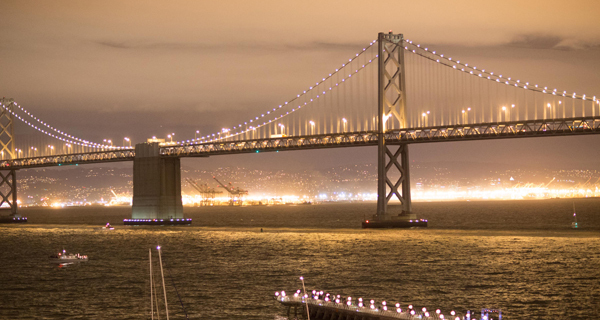 维拉瑞尔的作品被誉为世界上最大的LED发光雕塑。绵延2英里,项目的实行与艺术、技术和政治等领域以及市政部门的大力投入是分不开的。在贵宾晚宴上,有来自各界的代表,在可以观光的地点,都有其他的一些聚会,本地原本就很热闹的餐厅生意更加火爆了。官方的活动由加州副州长和旧金山前市长嘉文•纽森(Gavin Newsom)主持,客人来自四面八方,艺术界的人在此已经相当不重要了。我跟不同的人聊天,他们当中有律师、旧金山MoMA的馆长尼尔•贝涅兹拉(Neil Benezra)、生活方式杂志的出版人、艺术嘉年华‘燃烧人’(Burning Man)的常客(维拉瑞尔也是其中之一)、程序员,甚至一些艺术家(Ken Goldberg, Ana Teresa Fernandez),大家聚在一起期待一座没有金门大桥著名、但交通却更加密集的大桥的新貌。尽管现在奥克兰比马林郡在文化活动上更活跃,但旧金山市长艾德•李(Ed Lee)还是出席了,且没有骚扰奥考兰的官员让•昆(Jean Quan)。
