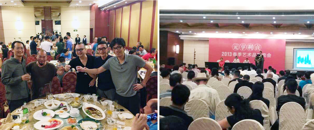 7月28日上午十点钟的亮马河饭店,几位8G艺术家悉数到场,表情并不沉痛,只是困,倒是总策划人沈其斌面色凝重,如同悼念。当然这些也都可以是表演,取决于你坐在观众席的第几排观看。演技如何?就我们经年累月观赏谍战片训练出的眼光——假作真时真亦假,仍是无解。楼上搞拍卖,楼下办婚礼,红色是主色调,非常中国特色,非常无法谈及格调。中国有钱人的着装风格又一向暧昧——POLO衫和中式风也可以属于无钱有闲的阶层。哪些是买家,哪些是看热闹的,甚至哪些是一大早从宋庄赶来的,一时难以分辨。