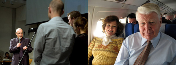 周六,我们的队伍坐上螺旋飞机,向北出发,来到了这个国家的第二大城市Akureyri(人口1万7千3)。总统 Grímsson坐在第一排读报纸,他那位以色列出生的妻子Dorrit Moussaieff则向他推荐着她最喜欢的冰岛设计师。中午到达这座城市后,我们参观了在 Akureyri艺术博物馆举行的“面向中国”的展览,之后来到了好玩的 Safnasafnid民间艺术博物馆,在这里,“外来的”艺术家所做的当代装置和传统的文化艺术品并列放在一起 。随后,我们来到 Eidar艺术中心,受到了年轻舞者们的欢迎,接着徒步穿过泥泞,去看场地中间 Paul McCarthy 和Jason Rhoades 2004年的装置作品。