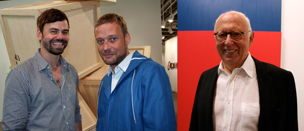 沿着在 Victoria Miro的过道,我看到了快乐的艺术组合 Elmgreen和 Dragset, 在下届的威尼斯双年展上,他们将策划两个展厅,兴奋之情溢于言表。他们策划的展厅一个是挪威厅,因为 Dragset来自挪威,一个是丹麦厅, Elmgreen来自哥本哈根。这两个人(之前是一对儿)来这里看他们的装置 Crash . . . Boom . . . Bang!, 2008,它由摇摇欲坠的筐组成的塔状物,喷溅出来的东西既像赫斯特的涂漆画,又像昆斯的银兔。从来不会错过巴塞尔的美国 Rubells 家,高高兴兴挖走了这件作品。