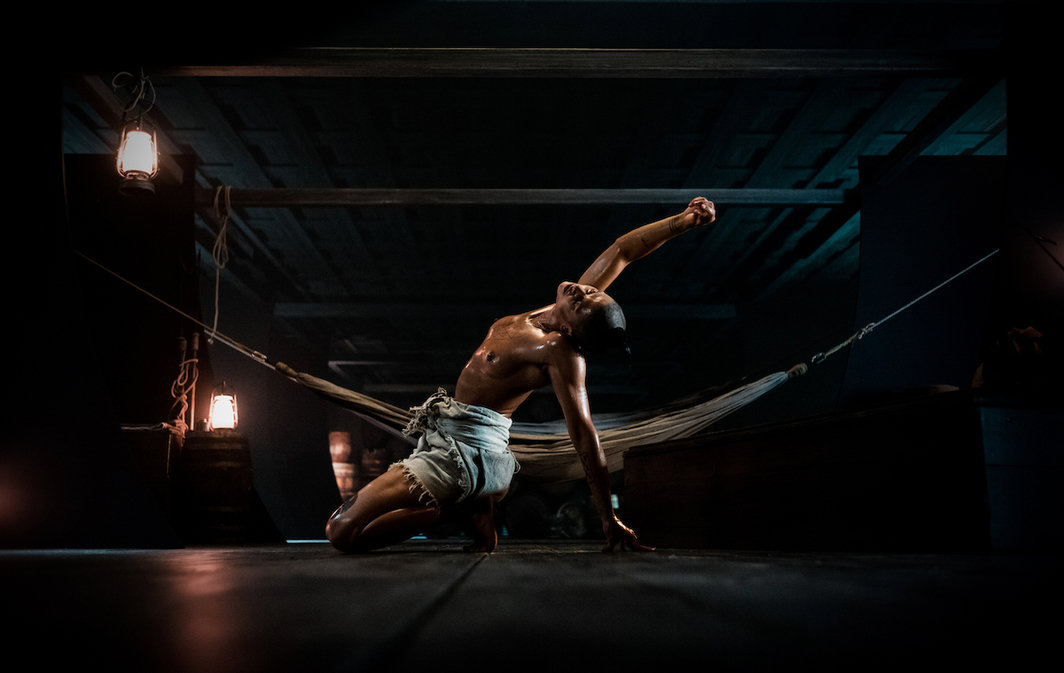 曾吴这部由索菲亚·阿尔玛利亚(Sophia Al-Maria)撰写剧本的作品被标榜为无声电影,这部分属实——以实玛利、魁魁格、埃哈伯等人的对话均以字幕的形式展开。现场室内乐团演奏卡罗琳娜·肖(Caroline Shaw)和安德鲁·叶(Andrew Yee)的作曲,伴随着咯吱作响的木头声和滚滚雷声。不过这部电影有着当代的框架:由理论家弗雷德·莫顿(Fred Moten)扮演的神秘的次次级图书管理员(Sub-Sub Librarian)在一个布满散乱书籍的圆形剧场内读出旁白。莫顿扮演的几乎就是莫顿本人,他是“这个”传奇的叙述者,其中嵌套了白鲸的传奇——类似于曾吴的原始文本。白鲸游过创世之前的黑暗,早于《圣经》的创世纪篇(次次级图书管理员如是说),并在其后继续存在于世。白鲸摧毁黑船后,以实玛利浮出水面讲述梅尔维尔的故事,而曾吴的故事由沉入水中的皮普(Pip,身份设定为一个孩子,由提蒂尔阿尤·阿德巴尤[Titilayo Adebayo]扮演)——一个因为大海发了疯的船员——来讲述,他不断沉入黑暗,最终发现了他们这个次次级图书馆中第一部书:镶金的精装版《白鲸》。
