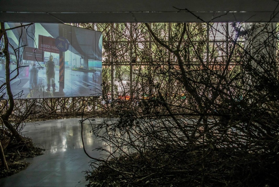进到这个展场你会有一种体验,比如树枝的味道,会让人产生一种突然应该慢下来的感觉。空间也很宽,其实没有放太多的东西,而且我有很多影像材料是准备替代的,我会通知美术馆定期换一组新的影像。这个空间说大不大,说小不小,并不足够放更多的东西,我就放了现在这些。逐渐的,我感到这个展场在变为一种时间的场域,你可以花很长时间在里面,也可以花很短的时间,所以它是一种深度的概念,不是宽度的概念。当你注意到这一点的时候你也许会在其中沉浸很久,这和看一部一两个小时的电影很不一样。去看楼下的观众才好笑:我本来把枕头放得很漂亮,现在已经乱七八糟了。我觉得也很好,每个人会找自己坐着的方式,尤其是晚场的时候,很多人是拿着椅子自己找位子,并不用帮他排序,坐地上也可以。虽然没有像戏院那么舒服,但至少美术馆在这里产生了一个区别,它让观众意识到自己不是在戏院看电影。