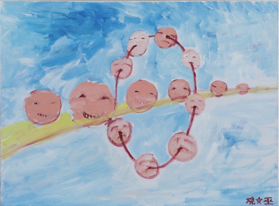 这三个系列基本是同时创作,互相交错着进行的。有几张画会把不同的系列整合到一起,比如整个系列里最后完成的《烧女巫4》(2018):一串感觉没有生命迹象的脸在中间,边上这些还笑着的像在看热闹。画面上圆圈中间穿过一条弧线的结构,其原型是灼烧的“火圈”,哪怕你身处权力系统的结构上层,也难免每天都有像跳火圈一样恐怖的事需要面对。