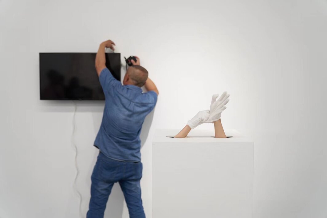 身体被装在展台里的状态,让我联想到“囚”字的象形:人被框住,限制了自由。我不再是一个人,只是一个拥有双手的对象,身份也因此变得不可见。正是展台的承托,让工作的手势从日常行为变成了表演。除此以外,刚开始驻地的时候,我端着摄像机走进工厂车间或布展中的画廊和美术馆,总是会引起工人的侧目。只要我在场,大家就变得拘谨,工人不再开玩笑、吹口哨,而是表现出沉默、认真、严肃的工作状态。劳动因为被观看变成了表演。而我的在场,就像是见证了美术馆和画廊的非营业时间里工人的演出。