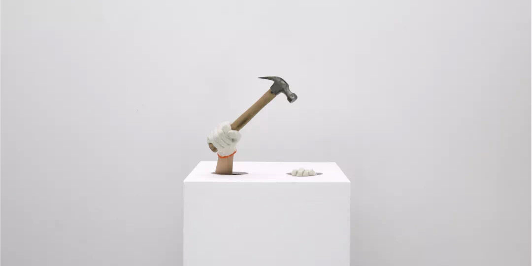 于是在开幕当天,布展师傅陈俊在观众的注视下把装着我的白盒子抬到现场。我有意将这两个时空折叠,编织出三条对应的关系——两种劳动,两种手套,两个锤子。我表演劳动的手势,而工人在我的表演过程中,安装《工作姿势》这件影像作品,成为表演的一环。我在戴着粗麻布劳保手套时使用了各种布展工具,而戴上精编棉布手套后,我的手势不再指向任何具体的动作,而只是优美的滑动。锤子先是在布展时作为不可或缺的生产工具出现,而在表演中的“拍卖”环节则作为定价象征的演示物登场。总体而言,我试图混淆表演和劳动,或者说重新定义表演。它不仅是在观众面前呈现的现场,而是劳动、研究、存档、建构和呈现的整个过程。