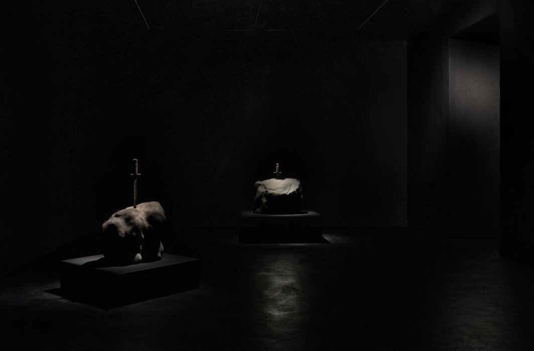 另一个重要的角度是,在这段道歉的历史中,缺席的是什么?比如那些曾经是共产主义政府的东欧国家和一些集权政治的亚洲国家往往找不到多少政府道歉的记录,我就没有找到越南、泰国的道歉,北朝鲜的道歉在作品里也只有两段,一段是因为新冠疫情,另一段则是因为经济发展不好。俄罗斯道歉的议题则是普京说他们国家的鸡蛋太贵了。除此之外,我也并没有找到以色列的道歉。所以,你开始会去想为什么这些国家没有道歉,或者换一句话说,为什么他们不需要道歉?这次除了三通道录像之外,我还在展览里放入了一组名为“石中剑”(Stabbed In The Back)的雕塑,讲述了一个关于背叛的故事——它不仅仅指涉了国家最高权力意志者对人民的背叛,亦是人对人的背叛。