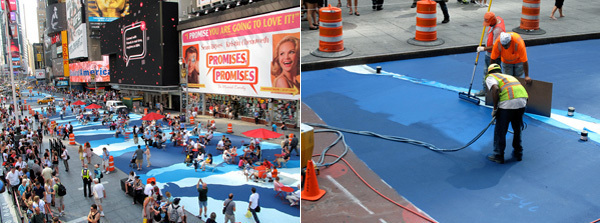 布鲁克林艺术家茉莉•迪尔沃斯(Molly Dilworth)接受纽约交通部的委托,打造曼哈顿有史以来最大的公共艺术项目:在时代广场创造一个临时性的定点装置,为城市街景注入新的活力,令其焕发新光彩。迪尔沃斯的作品《冷水,热岛》(Cool Water, Hot Island)是一幅五万英尺的油画,跨越五个城区。她关于这个项目的日记,可以在艺术家的Flickr上看到。