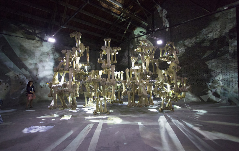 模型研发阶段,通过模型制作,在三维角度考量造型的视觉性和结构的合理性。进一步的MOCKUP(1:1的模型测试),接着制作1:1大模型的,进行行走动态的测试。骨骼雕塑部分的设计制作,“太极”共有220块骨骼,这些骨骼取自人体的四肢骨骼造型,用传统的雕塑手段按比例放大,泥稿、翻制、着色、预埋投影机(骨骼内有影像)等工序。机械传动部分,它的行走由两个电机驱动的一套动力系统和一套由PLC程序以及四个红外传感器构成中控系统来掌控,“太极”有一定的智能,可以识别空间中的墙体和观众来决定它的行走路线。影像部分,“太极”总共有108部影像,这些影像如“灵光”一般从体内射出,在动态中以不确定的方式漫布在身体表层和空间中。