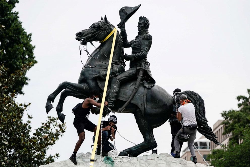 2020年6月22日的反种族不平等抗议示威过程中,抗议者试图推倒白宫前Lafayette公园里的安德鲁·杰克逊雕像. 图片来源:Joshua Roberts/Reuters.