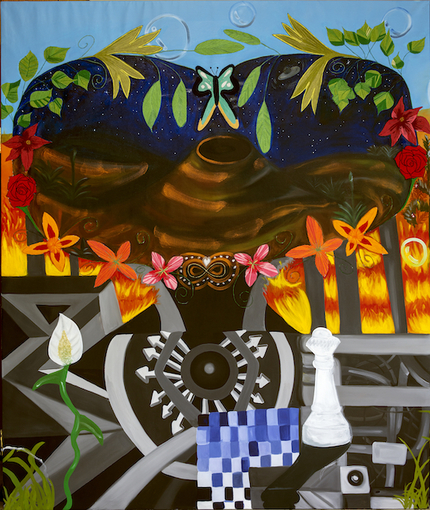 弗里达·托兰佐·耶格(Frieda Toranzo Jaeger),《时代走到了尽头》(Times Come to an End,局部),2021,布面油画与刺绣. 图片:LAR Arts and Reena Spaulings.
