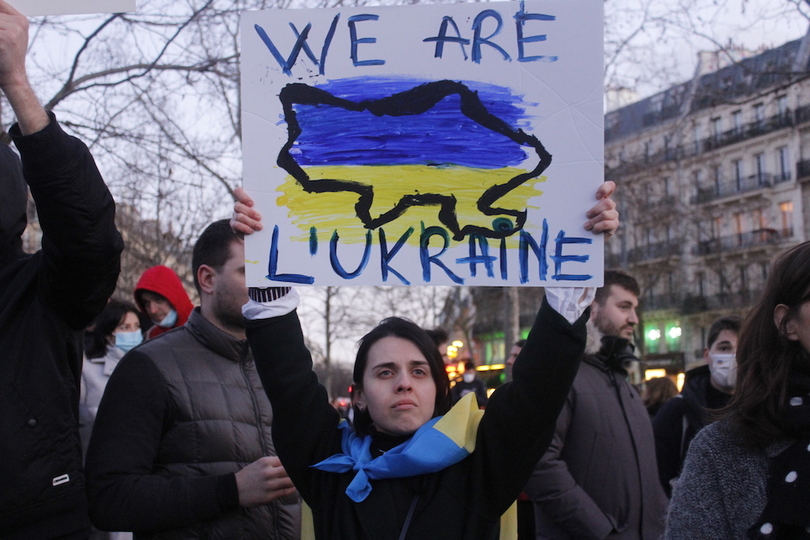 声援乌克兰的人们在巴黎集会. 图片:Esra TaÅkın/Anadolu Agency via Getty Images.