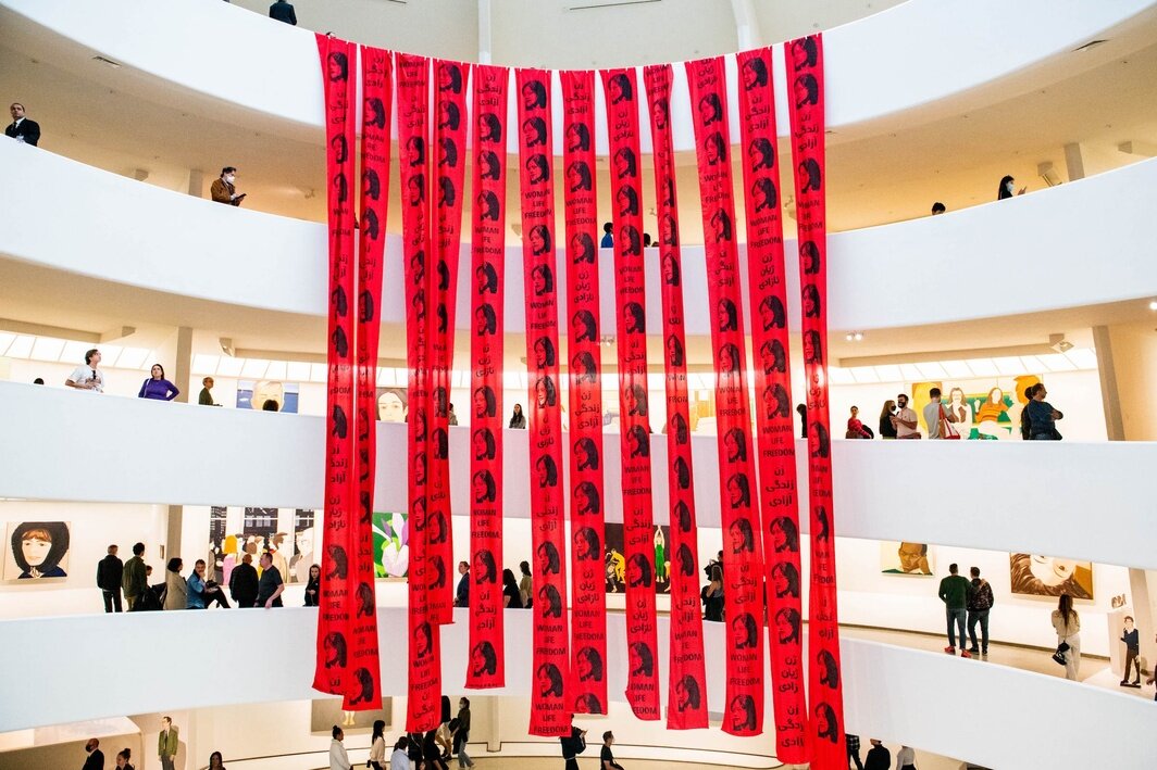 10月22日,位于纽约的“支援伊朗的匿名艺术家”(Anonymous Artists for Iran)团体在纽约所罗门·R·古根海姆博物馆进行示威行动,抗议今年秋天伊朗“道德警察”杀害玛莎·阿米尼(Mahsa Amini)事件。该行动团体的成员在古根海姆博物馆标志性的旋转楼梯的顶端展开十几条鲜红的横幅,上面印有22岁的阿米尼的肖像和“女性、生命、自由”的口号。与此同时,世界各地正在进行支持伊朗女性权利的抗议活动。