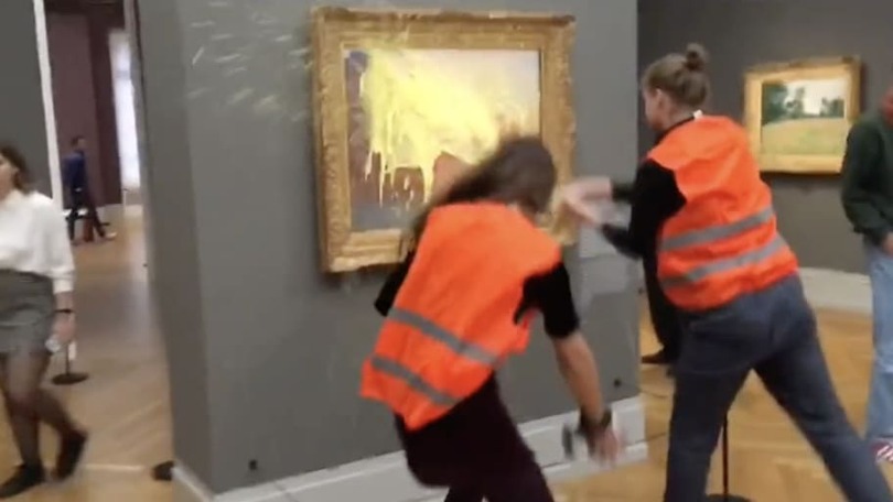 德国气候变化行动组织“最后一代”(Letzte Generation)的两名成员周日用土豆泥泼洒克劳德·莫奈(Claude Monet)1890年的画作《干草堆》(Meules),以引起人们对气候危机的关注。泼洒土豆泥后,两位行动者各将一只手粘在墙上,跪在这幅价值1.107亿美元的画作前,向周围聚集的观众讲话。这次行动发生在德国波茨坦的巴贝里尼博物馆(Museum Barberini),与本月中旬“停止石油”(Just Stop Oil)团体的成员在伦敦国家美术馆用番茄汤泼洒文森特·梵高的《向日葵》的行为相呼应。与梵高的作品一样,莫奈的画作也有玻璃屏保护,因此完好无损。