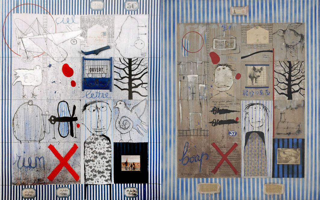 左:克里斯蒂安·西尔万,《枯叶》(Les feuilles mortes),1985,纸上混合媒介,120× 110厘米. 右:叶永青,《生日的记忆》,1995,布面水墨和纸张,189 × 149.7 × 3.4厘米.