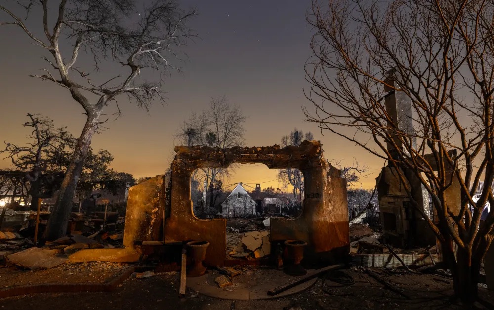 被伊顿大火烧毁的建筑废墟,2025年1月10日. 图片:David McNew/Getty Images.