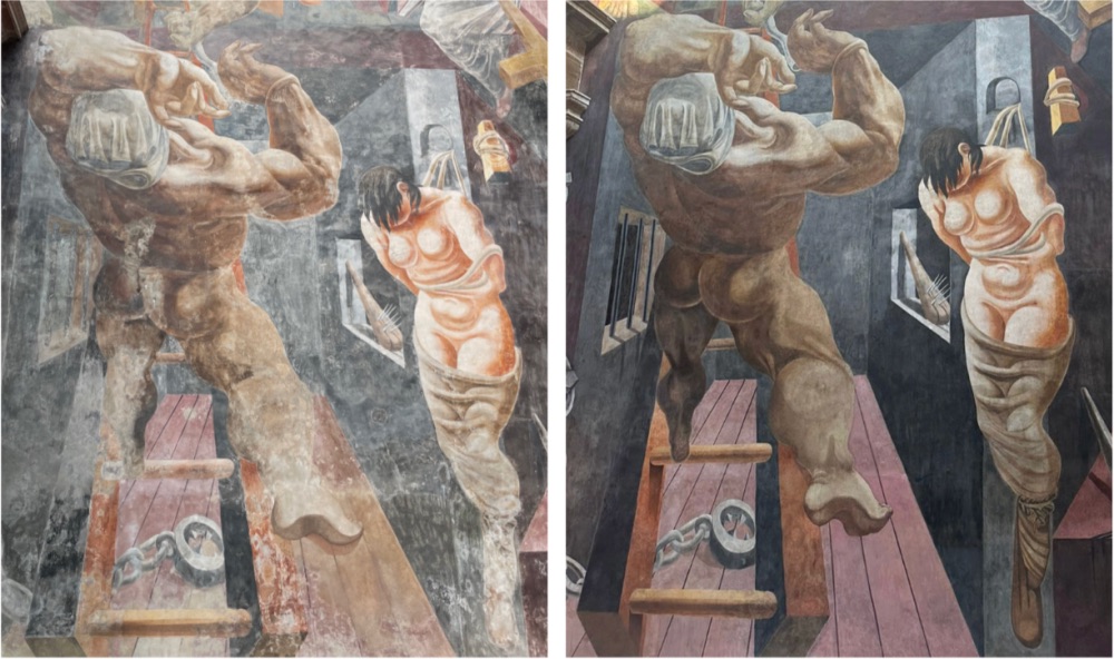 这幅壁画在完成时曾备受赞赏,但在20世纪40年代中期,由于其宗教象征和赤裸的人物形象,招致了当地神职人员的谴责。为了避免进一步冒犯宗教团体,同时防止壁画内容激怒一些人,博物馆用一块巨大的画布屏风将其遮挡起来。1973年,博物馆对壁画上方的庭院进行翻修时,这幅作品才得以重见天日。尽管当时壁画已有明显损坏,但基本保持了原貌。此前曾对画作有过一些表面修复的尝试,但由于阳光和湿气的侵蚀,修复效果并不理想。最终,在加斯顿基金会(Guston Foundation)、墨西哥文化部和国家艺术与建筑遗产保护中心的合作下,壁画得到了全面修复。加斯顿基金会主任萨莉·拉迪克(Sally Radic)主导了这场为期六个月的修复工作,并由阿根廷建筑师路易斯·拉普拉斯(Luis Laplace)设计了一套防潮系统,以保护修复后的作品不受湿气影响。