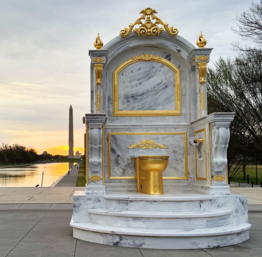 一座巨型金色马桶突然出现在华盛顿特区的国家广场(National Mall)上,这是近几个月来该区域陆续出现的一系列游击艺术装置中的最新一例。这座近十英尺高的“马桶王座”上附有一块铭牌,暗指特朗普对林肯浴室的翻新工程所引发的争议。据Artnews报道,“秘密握手”(the Secret Handshake)艺术团体已宣布他们是这件名为《王者之座》(A Throne Fit for a King)的讽刺作品的作者。“每天全世界有如此多骇人的事件发生,人们很容易忘记这位总统实际上做成了什么,比如翻新林肯的浴室,”“秘密握手”团体告诉Artnews。