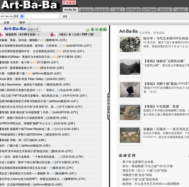 Art-Ba-Ba当代艺术社区最初以BBS网络论坛形式,搭建了一个开放、互动的艺术交流平台,通过艺术资讯收集、举办艺术及学术讨论活动(流动空间、未来的节日)、艺术文献收集及整理(超级资料)、出版艺术刊物(《精页》、《几何》)等,在当时与网友共同营造了一个活跃的本土当代艺术社区。