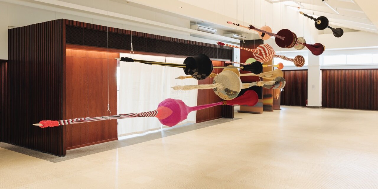 女性艺术家在“感知的仪式”中占了相当高的比例,但其经验更多被转译为一种感知形式的研究。性别问题并未消失,而是被重新编码为一种可被审美化的感知差异。特丽莎·巴加(Trisha Baga)的影像《MORE》(2025)将儿童视角、宇宙影像、日常碎片与数字技术并置,利用3D眼镜制造失衡感,将感知具身为一种持续被数字信息流(被“更多”)牵引的渴望。尹秀珍的《武器(箱号 20)》将旧衣物、晾衣杆、厨房刀具组装成导弹形态,家庭空间的亲密与暴力的抽象形态被强行缝合。作品显然指向女性劳动与国家权力之间的纠缠,但在展览语境中,这种指向被高度形式化。织物的色彩、平衡的结构与悬浮式的展陈方式削弱了其潜在的不安感,作品更像一种被安置妥当可供观赏的隐喻,与入口处如高级料亭暖帘般轻柔飘动的白色棉布共享同一套美学语言。