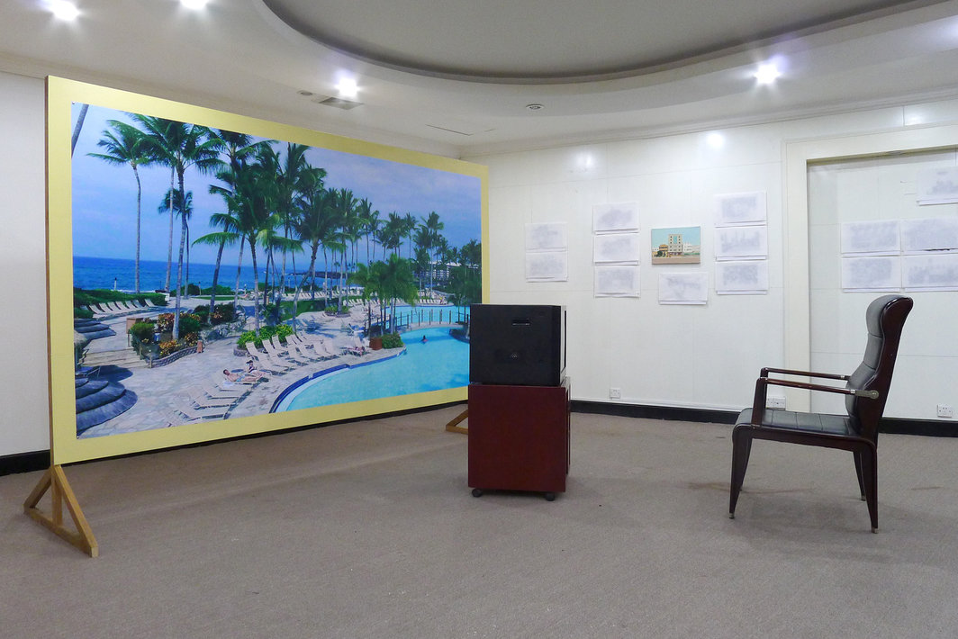 《冯火》从2013年至今的所有出版物满满排布在展架,杂志风格在井然的秩序感下生发出一种行业内刊的气质;覃小诗的辩论比赛除了在开幕时作为现场表演出现,还在会议室空间里循环播放,仿佛那些来回讨论又开不完的工作会议;唐潮几乎没有变动原先的布置,警察局摄影师的作品恰当地呆在办公室,像一批有待归档的工作材料。三楼的展陈则为每位艺术家提供了一个房间,佩恩恩贴满银色隔热膜作为背景,杨圆圆画出红色马赛克瓷砖质感的墙面,这几个小格间变化丰富多样,总体上又类似一片样品展示的区域。林奥劼的视频《收藏之前》(2016)中,几个年轻艺术家围坐在工作室闲聊,探讨如何被藏家收藏的话题,他们像任何生产者那样在忧虑着生存与效益。而奶粉zhou在建筑外立面的大幅涂鸦,将展览标题包含于画面,相当于担负起了广告宣传的职能。