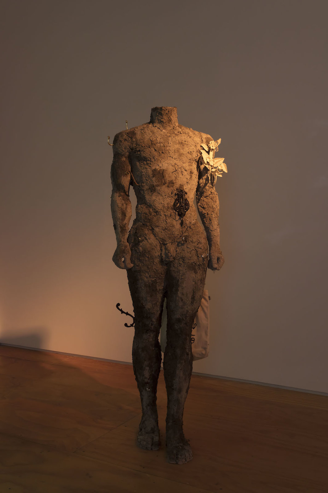 三个人展示的作品皆创作于2017年,对各自熟稔惯用的媒介进行了形式与意义上充分的探索。王旭接受了中美两国学院派的雕塑训练,作品《A Stand》(2017)以古希腊Kouros风格为参考。临摹西方经典是在中国学习雕塑的必经阶段,这种训练将个人对形状的认识与记忆与某种含糊的同西方的联系凝聚在一起。作品半风干的泥土质地显出未完成的手工感,壮硕健美的躯体略大于真人,且周身插满挂钩而显得更像一具实用的衣架,这来自于王旭在制作过程中常常顺手往雕塑插上棍子以便临时悬挂自己衣物的个人习惯。作品使雕塑介于纯粹的艺术与可用的物品之间,有关艺术家与其创造物之间关系的隐喻。