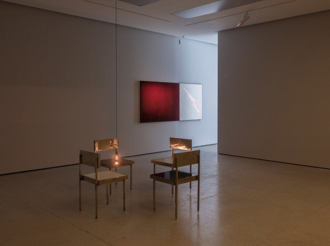 液体的流动与静顿似乎是贯穿整个展览的隐喻式线索,在一批近期重现的1990年代作品方案中,它们或与木质桌面组合成为具有视觉误差的两个平面,在马达的作用下时而平若镜面时而震颤出褶皱密集的极简图像(《地平线》);或变幻为录像中倒置奔流的海浪(《一粒沙》);或是《加湿器》中婴儿摇篮里可供窥探的山林景观所溢出的雾化液气(这种窥探的观看方式也让人直接联想到《布鲁克林的天空》中艺术家在工作室里制造的盛有大洋彼岸天空录像的地井);又或是木质长凳中浸嵌着发光灯泡、固态般的防冻冷却液(《平等》)——这一质感与另一件平面装置《残阳1号》中画布上喷涂的汽车外漆和其拼接的大理石材不无相似。此外,即便在液体并不在场的录像装置《今夜可能有风》(2006)中,不同播放速率下柳树枝叶的缓移与震颤,似乎仍旧回应着液体的流变状态,及其所暗喻的变动性与多重形态。