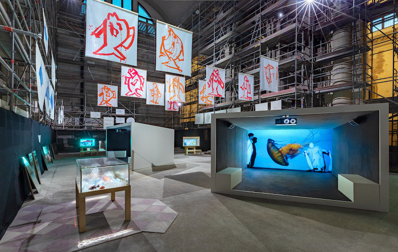 琼·乔纳斯(Joan Jonas)的展览“迁出陆地II”(Moving Off the Land II)制造了一个充满梦幻色彩的人工洞穴,身处其中,你会觉得自己仿佛置身于大鱼腹中。如同骨架一般的金属手脚架层层叠叠地覆盖了建筑内墙,这座十六世纪的教堂建筑如今是威尼斯海洋空间(Ocean Space)的场馆,该空间主要致力于海洋研究和宣传工作。在此次空间开馆展上,乔纳斯选择保留圣罗伦佐教堂翻修时留下的这些施工痕迹,遮住了建筑原来的宗教背景,却丝毫不影响观众感受其宏伟的规模与空荡的回声。高悬于空间上端的是两种不同风格的海洋生物图像:一种是细致到可以做解剖研究用的彩色素描图,一种是用类似书法的笔触描绘的表现色彩十足的简笔画。