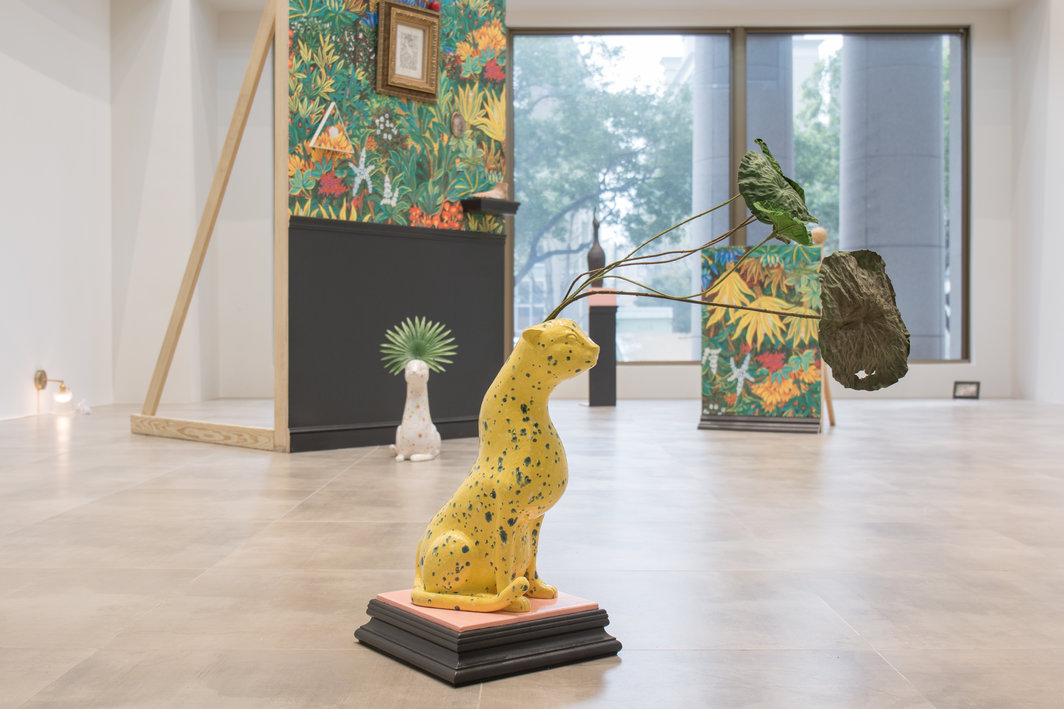 被视觉化的自然往往成为一种脱离脉络的符号充斥我们的日常生活。王佩瑄在《西雅图在做梦》(2020)中使用缤纷的丛林壁纸,轻而易举地营造出所谓的异国风情。蹲坐在牆角的陶瓷白兔、似猫似豹的雕塑戴着树叶皇冠;从丛林壁纸突出的结构被豹纹织品包里,它有可能是树枝也可能是鹿角。观看者的视线可以在作品的繁复缤纷中抬高仰望,也可以缩踞一隅凝视,但就是无法安适地找到自我栖居的位置,是否永远有一个待感知的他方?而自然成为未知的象征,仿佛一直潜藏在人类的集体无意识。魏泽的《崇拜:本原之源—亚马逊雨林 l 》(2020)乃是艺术家至南美洲考察两个月、接触当地原住民认知世界的方法与知识后创作。他认为人类总试图在有限的生命经验与认知范围建立起对无限与未知的诠释。反复诉说的神话、重复进行的仪式原型都反映了人类对自然的敬畏。所以他将亚马逊的种种自然风光如树木、河流根据自己身处当地的感受转化成图像扭曲的半抽象画面。观众在作品中依稀可以辨认出属于自然地景的元素,同时察觉一种更高的力量的影响。