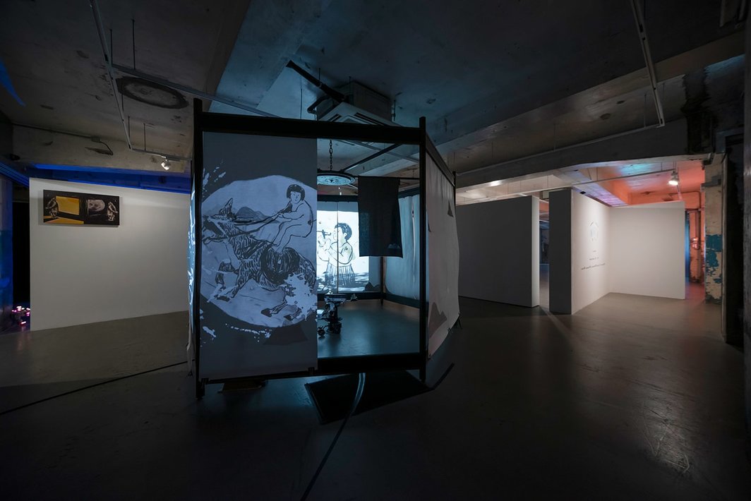 这场由郭瑛策划的展览中洋溢着16世纪意大利人文主义学者吉安巴蒂斯塔·德拉·波尔塔(Giambattista della Porta)1558年的著作《自然法术》(Magia Naturalis )中提示的“自然奇迹”(natures miracles)。五位参展艺术家的混合媒介作品检验了“作为魔法师的艺术家”这一常见比喻。其中几位艺术家利用光影来营造出超现实的环境。林东鹏的《大逃亡》(本文中提到的作品除标注外,均创作于2020年)以走马灯的形式将绘画、雕塑和影像结合在一起,沿着相连的假墙投射出一个山间梦境。附近,陈维那被色彩浸透的香港幻景通过其在摄影、霓虹灯和织物作品的残砾中慢慢浮现。