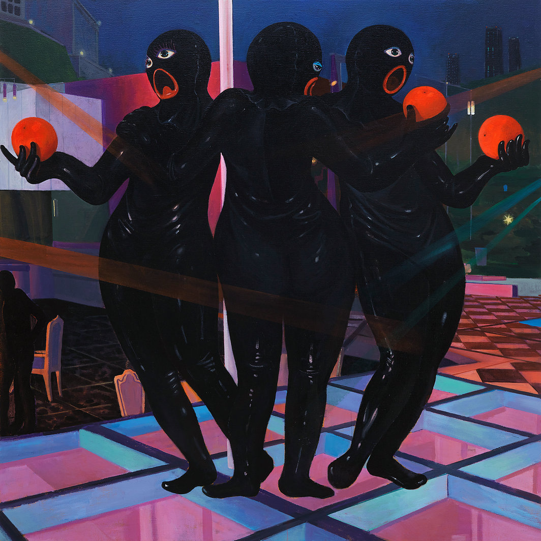 亨利·卢梭曾声称《我本人:肖像—风景》(Myself, Portrait-Landscape, 1890)创造了一种新的绘画类型“肖像—风景”,在这类绘画中,肖像的人物主体由他所身处的环境所定义。蔡泽滨此次个展标题的同名作品《旧地重游》便是在二十一世纪对这一类型的绝佳注解:不仅因为这是展览中唯一一幅正方形的画(考虑到Portrait及Landscape两个单词的含义已超出狭义的绘画领域,引申为可指代页面方向的“纵向”与“横向”,Portrait-Landscape似乎只能是方的),更因为在第一眼的似曾相识(“旧地重游”=地理上的dejavu)后,三女神所处的环境及着装很快反过来限定了她们的肖像。在夜店般交织的灯光里,二十一世纪长睫毛的夏娃们(又或许是AI?)穿着黑色乳胶连体衣,张着血红的大嘴,拿着红彤彤的硕大禁果,就好像她们自身与禁果之间已无分别。同样地,我们再也分不清《耍蛇人》手里的蛇和《献给微光#3》及《微光之曲》里像达利融化的钟一样弯曲成蛇形的蜡烛。