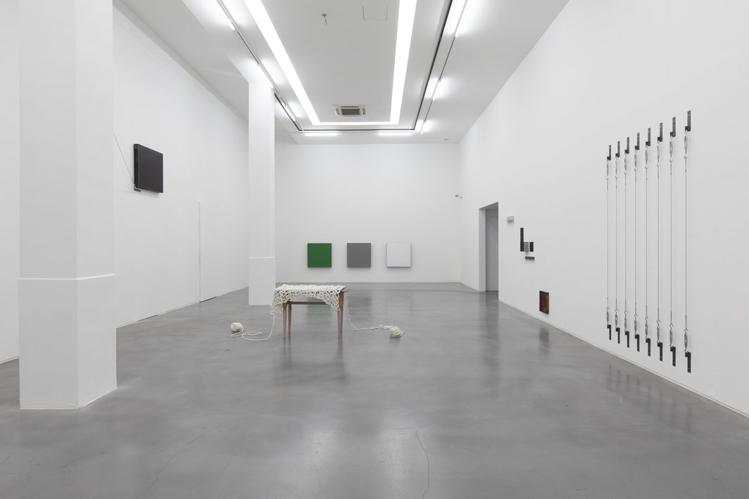 与小清水渐不同,原口典之是在了解物的表象和本质间张力的前提下,以主动的行为建构出一个“物”的共同体,让所有的元素在这个场域中互相影响、制约和对话。在《黑色立方体与钢索》(2019)中,浑厚的黑色立方体与紧绷的钢索关联在一起,形成两种不同力量的对话;《绿立方》、《灰立方》、《白立方》(2019)的并置让三个看起来同质的不同色块在静默中创造出某种平衡感;而《八条绳索》(2019)则通过八根绷紧的钢索,让紧张的力量得到反复强化。在状态更为复杂的“纸上作品姿态”系列(2019)与“墙与钢索”系列(2019)中,艺术家通过描画、折叠、粘贴以及摩擦、安装钢索等诸多手段来形塑物体。原口典之尽可能忠实地保留了材料本来形状,既彰显了各自不同的属性,又巧妙地让它们处在某种紧张状态中。而不同的张力则生成了不同的具体情境,其中,“物”的表象与本质之间的主客关系被重新界定,彼此映照,反复对话,不仅建立了形象的主体性,而且在互相回响的状态下,生成出了超越主体性范围的力量和意义。