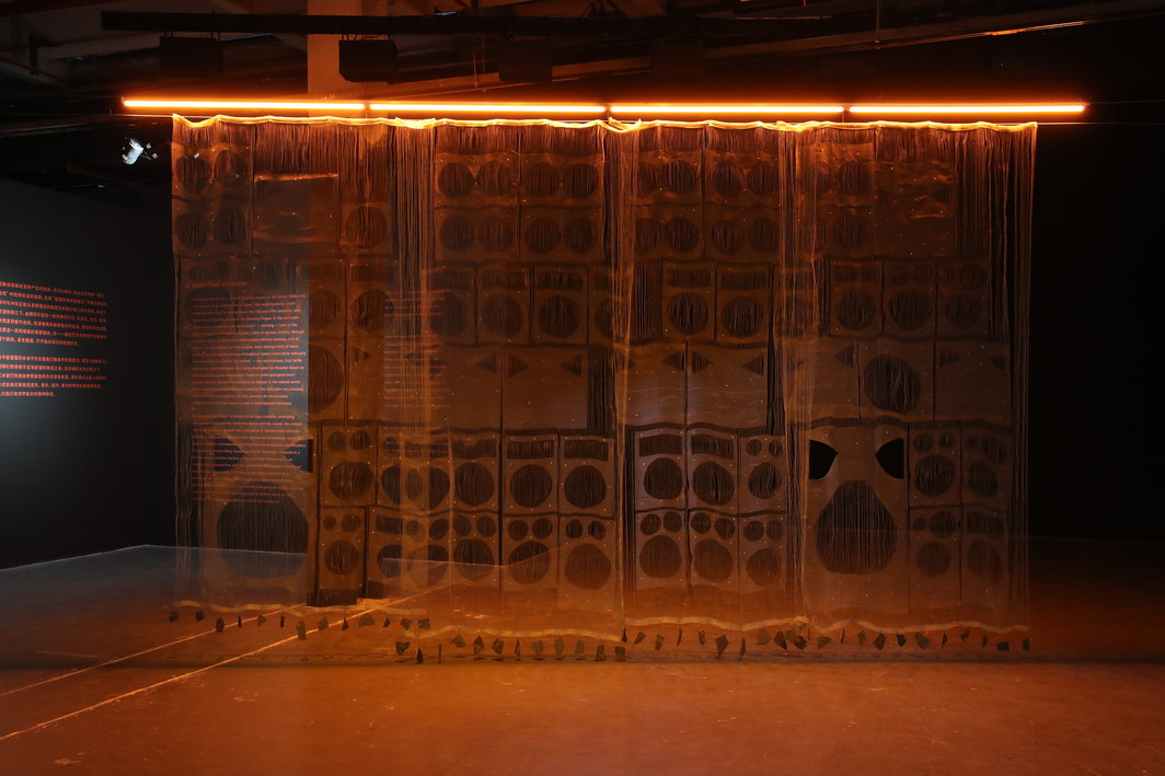踏入“神秘参与”的展览空间,迎面就遭遇一堵轻薄却又实在的、用透明蚊帐做成的墙,蚊帐上模拟了墨西哥街头音响系统的图像,一个扬声器播放着墨西哥流行音乐与艺术家在卡尔斯巴德洞穴录制的失真的音乐回声。艺术家薇薇安·卡库里(Vivian Caccuri)这件名为《幻影之尘》(Phantom Dust,2018)的作品给人一种虚实交错、捉摸不定的感受,如同一种隐喻,暗示着接下来我们将会进入一个对可感而不可知的世界展开想象与体验的奇特旅程。