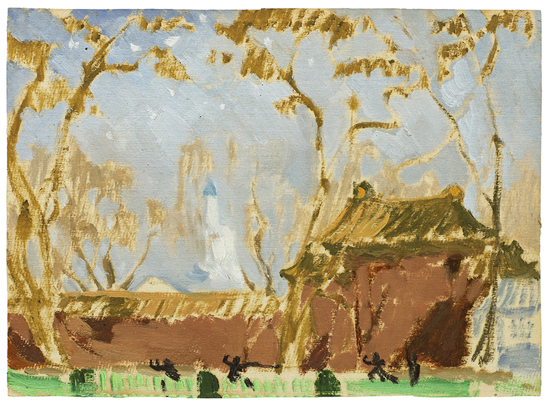 画家对留白和空隙的运用多是由于写生过程中的“客观性”,即对风景中透视关系不可避免的再现与描绘。不过,不同于学院派的技法,画面仅仅是通过留白与间隙,示意了前景与后景的区隔,因而矛盾性地用平面的手法暗示了立体的关系。而正是这些留白的舒朗之感,传达出画面中的情感与心绪:那是一种普遍的松弛与惬意,闲适由此而来。
