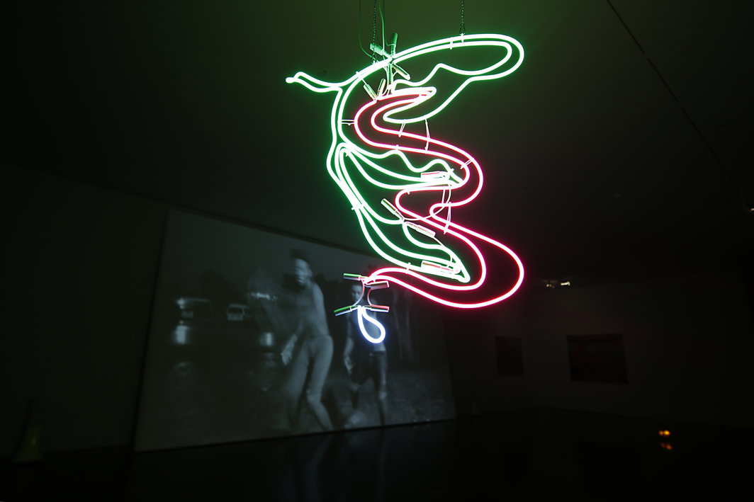 除了强调书写叙事的公共性,展览还着眼于叙事语言本身的物质性与形式感。在谈及本次展览与1970年代迪斯科舞曲《More, More, More》同名的展览标题时,策展团队指出,重复的音节淹没了字符的表意特性,随之浮现的是节奏、韵律以及语言本身的物质属性。如果说双重叠音暗含了某种天然的自我指涉——语言学家在分析“爸爸”、“妈妈”在不同语言中趋同的叫法时提出,这种现象不仅与婴儿初级的发声结构相关,更在于叠字通过重复明确了表意的必然性,这点与单音节发声的偶然性截然不同——那像“摸摸摸”(more more more)这样的三重叠音呢?展览以一系列节奏强劲的音乐和舞蹈主题的作品做出了回应。迪文·K肯尼(Devin KKenny)刻意在音乐中引入模仿唱片表面磨损产生的杂音,提醒观众辩证地看待媒介的消隐;而在隔壁展厅核心位置的一个投影屏上,塞西莉亚·本戈利亚(Cecilia Bengolea)正在电闪雷鸣的雨夜与同伴们酣畅淋漓地跳着牙买加街舞(《闪电之舞》[Lightning Dance],2018),舞者们在此刻仿佛化身自然的载体,身体力行地编织着叙事的网络。