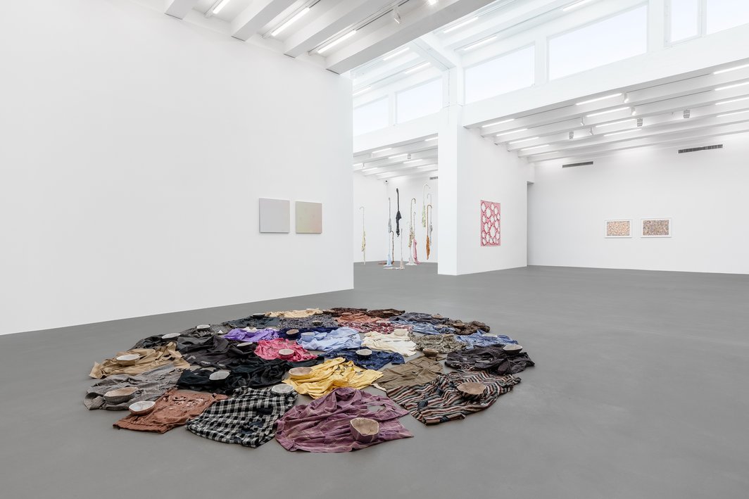 如同张雪瑞的绘画以“三原色”作为起点一样,她的三件装置作品都选择了用现成品——收集来的衣物或是布料——作为载体。这种容易被归类为“女性”惯用的材料对于张雪瑞来说,其意义并不在于凸显性别特质,而在于通过重组材料原有秩序去转换对物体属性的认知角度。在此过程中,艺术家不仅巧妙地在她的文字驾驭能力与艺术转换之间实现了对接,也将形式创作的意义范围延伸到了更大的社会关系中。例如,《疏离之物》(2015-2018)将衬衫和裤子的部分布料裁剪下来做成碗状以后再缝回去,不但转换了衣物的功能性,也在同一物件中置换了观看与被观看的位置。而《竹拐杖》(2016-2019)——“竹”的谐音为“拄”——更是将作为生长意象的“竹”嫁接到象征停滞的旧物上,甚至可以引申至有关传承的探讨。《红白格布》(2019)或许是三件装置中形式感最为突出的作品。张雪瑞先将格子布料上的红色、粉色、白色格子裁下来,然后在裁出来的空洞周围沿着边界将这三种格子按照颜色由深至浅重新排序缝回去。重新修补之后空洞依然存在,正是这种空缺暗示了自我意识与外部秩序对抗时需要付出的代价。这种个体边界与集体存在之间的张力,同样可见于此次展览的诸多水彩作品中。