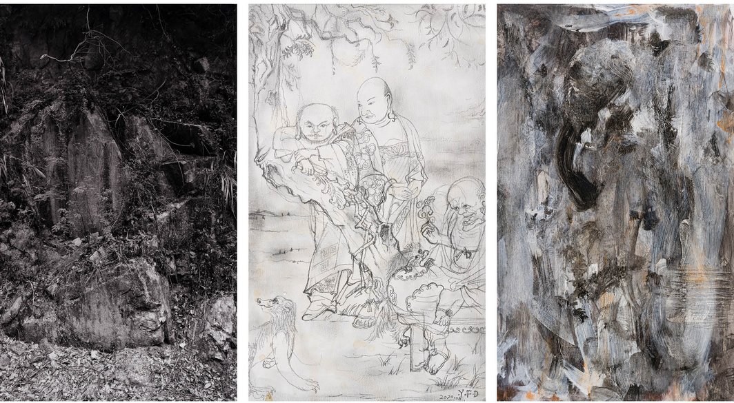 杨福东,《无限的山峰—是风 之二》,2020,木板上丙烯,素描,艺术微喷,30 x 18 cm (共三件).
