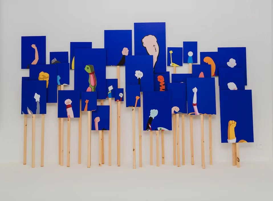 在新作《降维广场No.1》(本文提到的所有作品均创作于2020年)中,丁世伟挪用了安妮特·勒⽶厄(Annette Lemieux)1995年的作品《左右左右》(Left, Right, Left, Right)——2016年特朗普当选美国总统,勒⽶厄曾将该作品倒置展示,以表示自己的担忧和反思。丁世伟将原作中不同异见者的拳头置换为虚拟和动漫卡通形象,比如大力水手、忍者神龟、阿童木和黑猫警长等。它们的左手或右手高高举起,屏幕的蓝色背景成为数码时代新的广场和街头。在该系列的另一件作品《降维广场No.5》中,手机里emoji表情的“拳头” 分别代表几种颜色的政治,借助光栅板的三个重叠的图层,随着观众观看位置的改变不断在黑色、白色和黄色之间切换。“降维广场”系列以高举的拳头和手臂所承载的信息和政治指涉,呈现出不仅存在于历史和现实中,也存在于社交网络、数码虚拟界面的政治和情感诉求。这些作品以不同的媒介方式共同构成一个基于信息/数字政治和日常交织的数据场域。