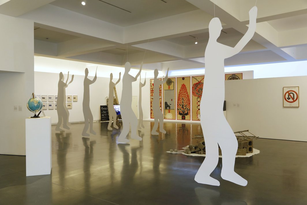 “巨浪与余音:重访1987年前后中国艺术的再当代过程”展览现场,2020. 图为池社作品《作品2号——绿色空间中的行者》,1986,白卡纸,高度3米,共9个,由艺术家授权北京中间美术馆复制.