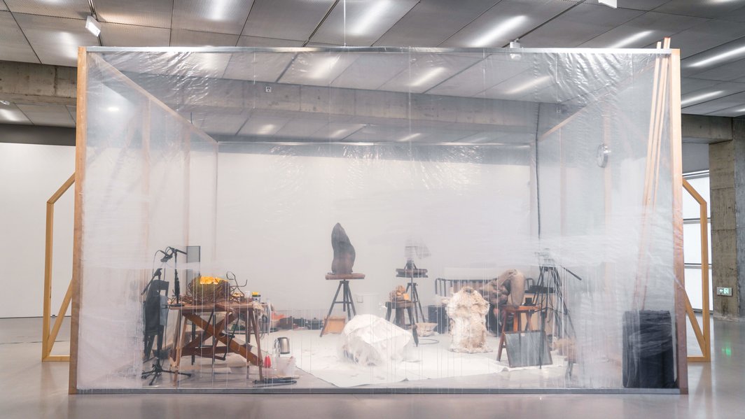 作为西岸美术馆与蓬皮杜中心五年展陈合作项目联合呈现的首个中国青年艺术家展览,在展期持续三个多月的“即兴判断II”中,于吉在西岸美术馆的0号厅内复建了自己的工作室,并邀请来自声音、影像、剧场等领域的创作者同处一室,通过各自带有即兴色彩的行为叠加生成一个复合型现场。展厅空间大致可以分为两个部分,中间是于吉用木结构和塑料薄膜搭建的工作室;四周即工作室外则依次摆放着一个音效操作台(主要供乐手颜峻使用),一块悬吊的投影屏幕(实时转播着现场摄像机在各处捕捉的画面),以及一些从于吉工作室延伸出来的元素,譬如零落四处的可供观众坐靠休息的小型木箱。这样的现场布置首先预设了一个复杂的语义生成系统——摄像机记录的画面经由信号转化投映在屏幕上,而声音也在电路的传导中被重新放大;观众不再聚焦于现场的某个局部,而被卷入物与物之间的某种调和关系中。