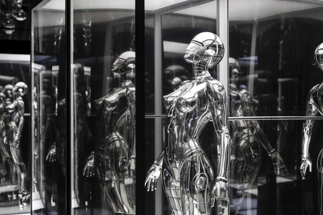 穿过闪亮的卧室,进入的是一间黑暗的“机械姬标本房”,其中展示的是装置作品《悬浮机械姬》。镜面折射制造出某种多重空间不断叠加的视觉效果,也让这些被献祭于其中的机械姬笼罩上了一层神圣的光环。这些悬浮着的机械姬头部向上昂起,双臂微微张开,宛若一名努力想要奔向自由的女性。这也让人联想到这次被用作展览海报中那位戴着脚铐飞翔的机械姬。在空山基创造的这个世界里,即便这些女性形象拥有了机械盔甲和连接未来的能力,她们也依然只是标本和承载男性幻想的偶像。这仅仅是空山基的欲望吗?不,这大概是所有男性的欲望吧。回头再看美术馆入口处那尊高达数米的大型机械姬雕塑,让人猛然意识到,那不是在对未来的想象,而是一尊象征着男性幻想的欲望图腾。